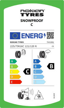 Nokian Snowproof C har Nokian Tyres unikke Aramid sideforstærkning, som øger holdbarheden og minimerer dæknedbrud. De super-stærke aramidfibre forstærker sidevæggen i dækket og giver beskyttelse - selv ved krævende kørselsforhold. Når belastningen er høj, kan rullemodstanden mærkes på brændstofforbruget. Gummiblandingen i Nokian Snowproof C er optimeret til kraftig brug. Dækket fungerer sikkert i et bredt temperaturområde og genererer mindre rullemodstand.